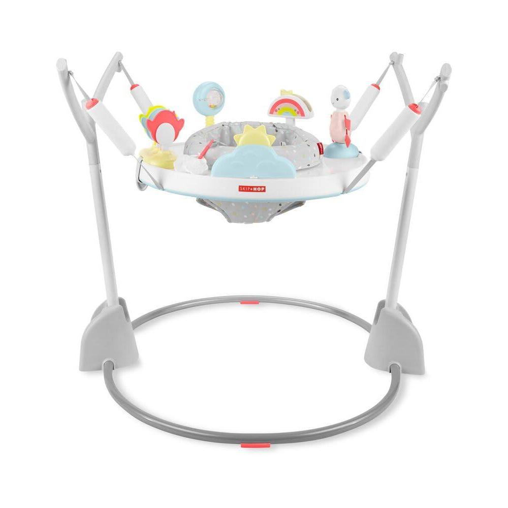 Designed to grow with baby in three stages, Skip Hop's Silver Lining Cloud Baby's View Activity Center is an action-packed take on our best-selling gym. Featuring the same developmental approach to play and learning as our Explore & More version, the decor-friendly design features a 360-degree rotating seat that turns and stretches for bouncing. Our unique Discover Window gives little ones a clear view of their feet as they play the light-up piano to connect cause and effect. Four dreamy toys can be rearranged for customized play. As baby grows, the activity center converts for easy cruising. At stage three, it transforms into a sturdy toddler table with a plastic chalkboard surface for drawing, playing-the sky's the limit.