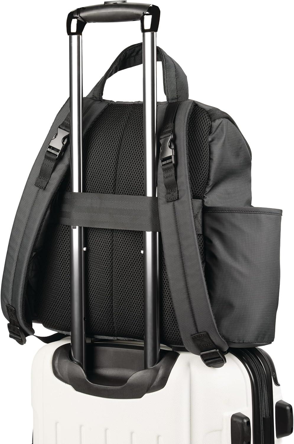 Padded backpack straps (adjust from approx. 13″ to 28″) and Easy-grab top handle