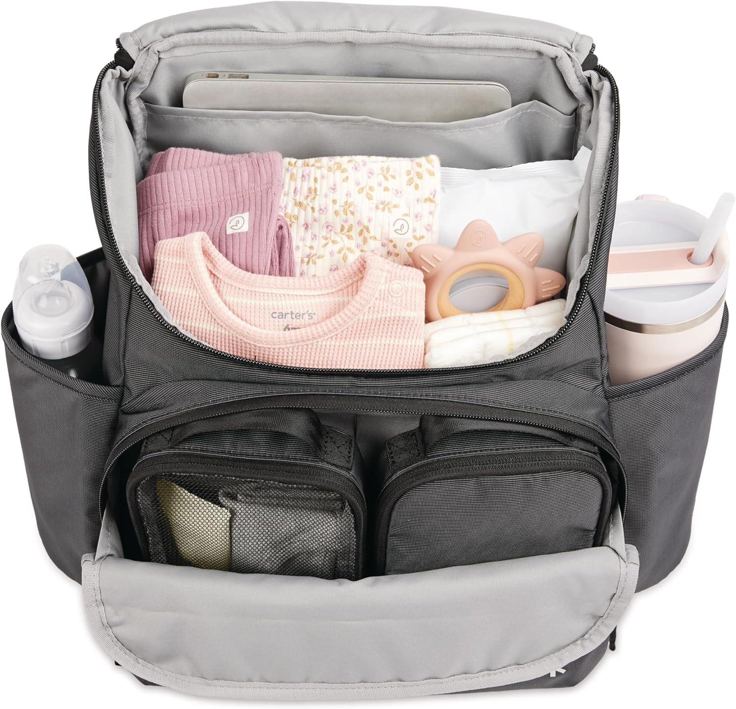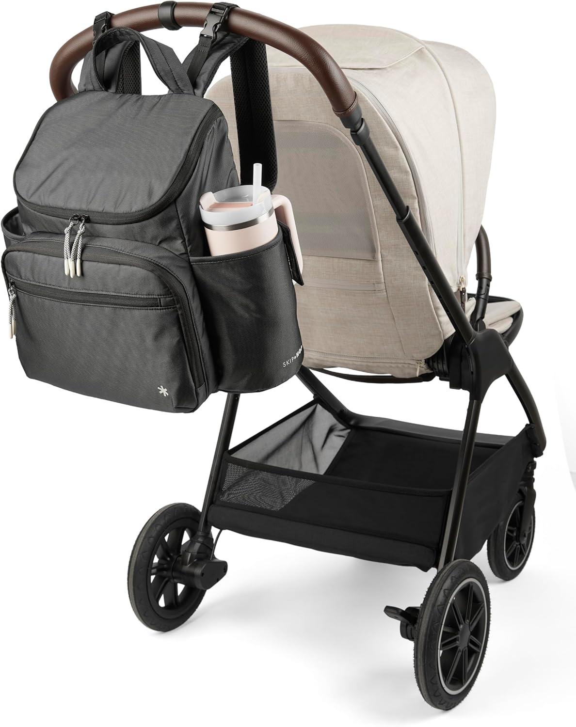 Skip Hop’s lightweight, quilted backpack offers hands-free ease and special packing cubes for baby's gear. The spacious interior fits everything from snacks to spare outfits and the extra wide opening makes it easy to find essentials in a pinch