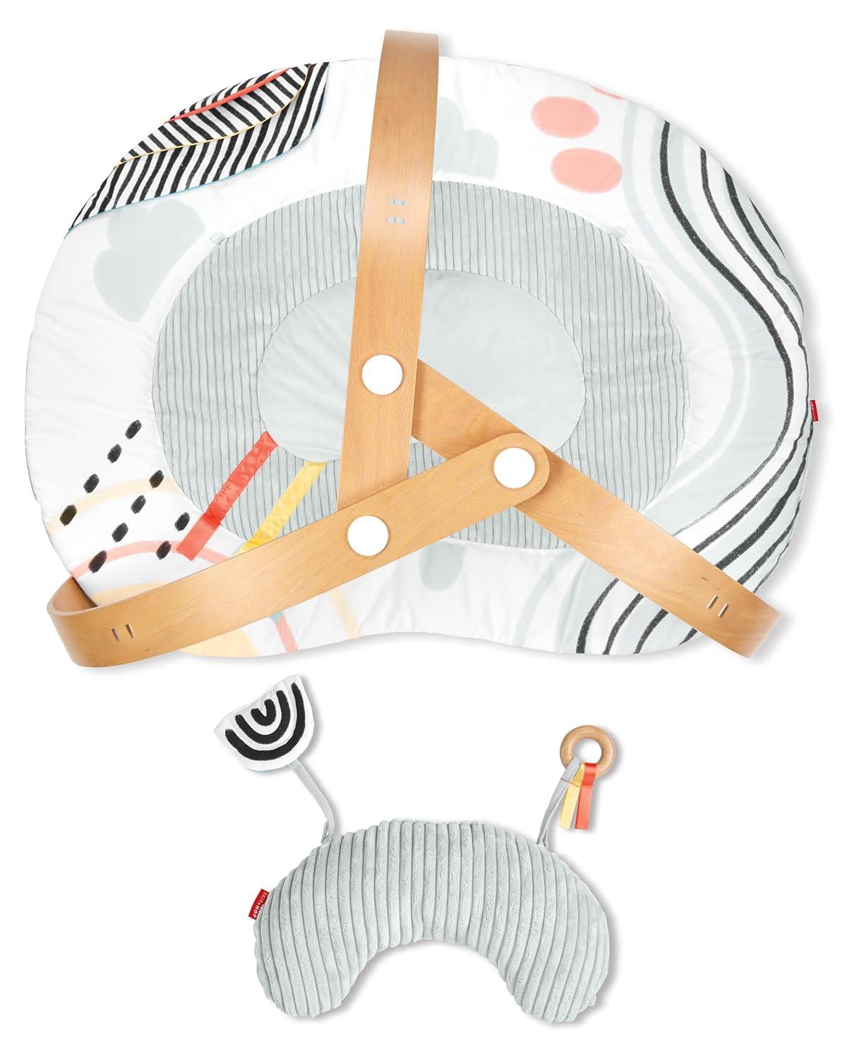 30+ developmental activities: 5 movable Montessori-inspired toys can be positioned based on baby's abilities. Rotating Sundial Mirror encourages self-awareness & recognition. The Mountain Mover stimulates focus and concentration via touch exploration. Paddle Spinners with moveable wooden beads encourage hand-eye coordination. The Mushroom Pod offers sound & tactile learning. The Wobble Wheels & Rolling Teether encourage grasping & coordination
