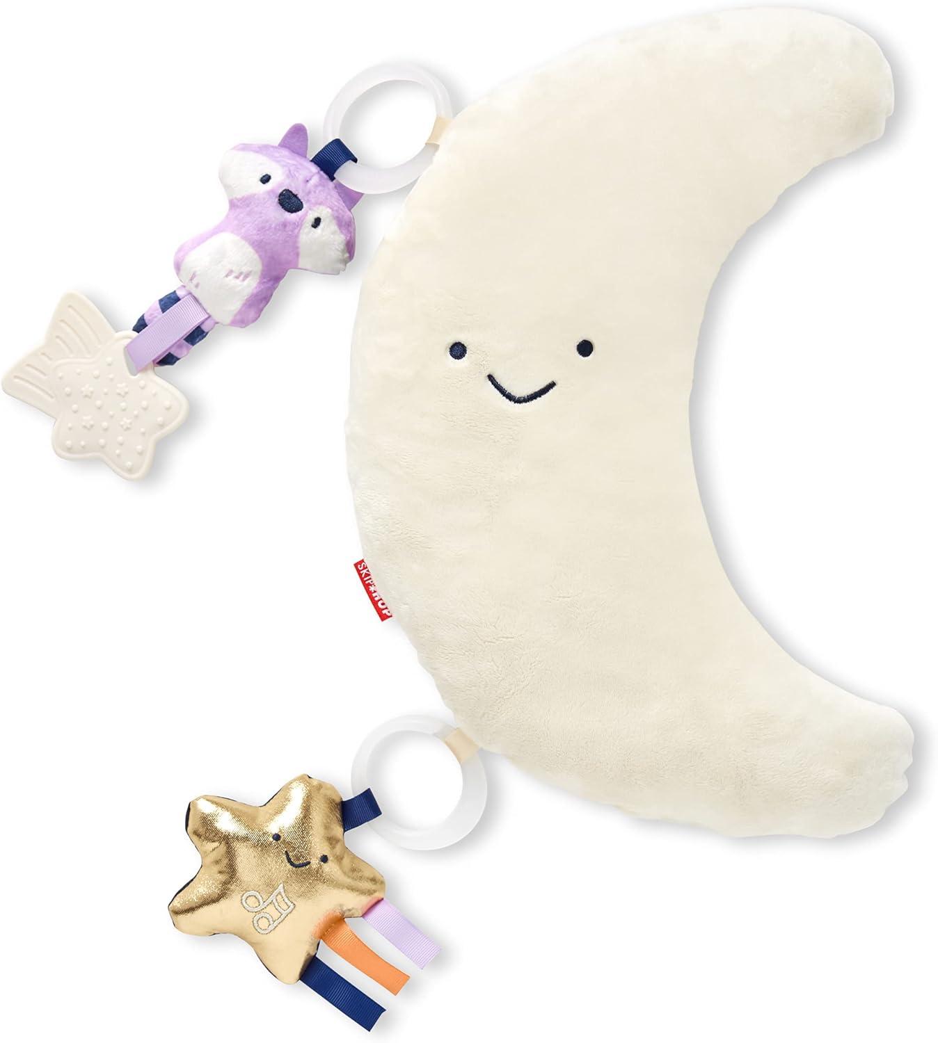 Packed with a galaxy of fun for baby, this dreamy activity gym features a celestial-themed playmat with plush quilting details and a crescent moon pillow for tummy time play. A removable shooting star baby mirror encourages self-recognition, while five nocturnal friends engage your little one’s senses with music, sounds, textures and more to explore.