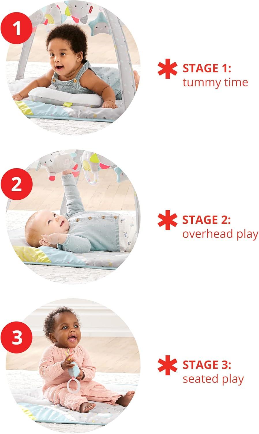 3 Ways to Play: Our Celestial Dreams Tummy Time Mat seamlessly transition between three play modes – tummy time, overhead play, and seated play – providing opportunities for your baby to learn and explore at every stage of development